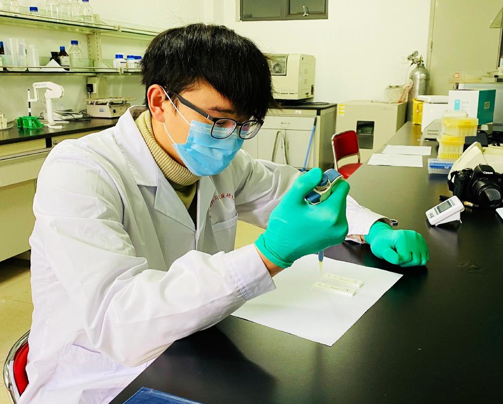 研究生董涛同学在研制新冠病毒快速诊断试剂盒