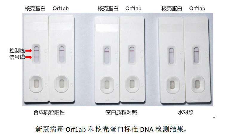 该检测方法主要采用一种新型纳米材料偶联等温扩增产物,放大检测新冠病毒核壳蛋白和Orf1ab区域的扩增产物信号,再通过核酸试纸法观测检测结果。通过实验验证,检测灵敏度达到目前广泛使用的实时荧光定量PCR,可将现在实时荧光定量PCR方法的4小时检测周期缩短为30分钟,且检测过程无需依赖专业人员及检测设备,操作简便、安全性高,为检测的家庭化、个人化创造了条件,特别适合居家自我检测。
