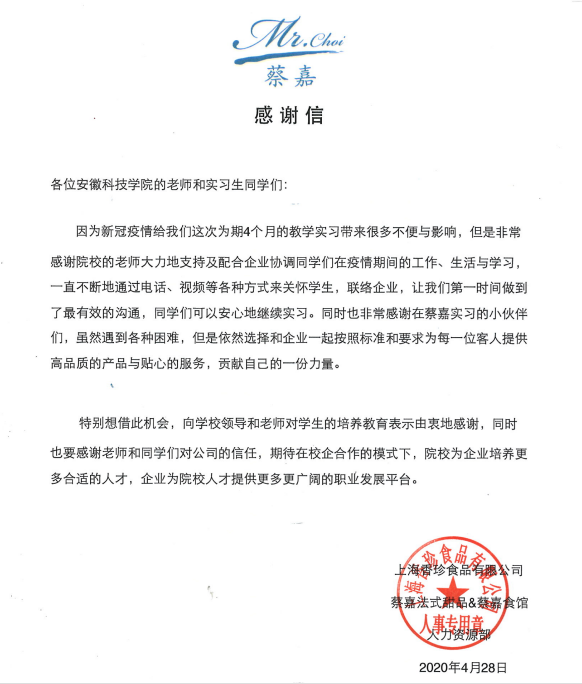 截至2020年4月30日,玩球官方网站_玩球(中国)股份有限公司,食品工程学院2017级烹饪与营养教育专业39名学生为期四个半月的校外专业实习正式结束。对于校外实习的这39名学生来说,是一次漫长而不同以往的实习经历。这次实习不仅让学生们学到了专业素养和技能,获得了实习单位的表扬和认可,更让他们从一封封来自援鄂医务人员的感谢信中学会了危难中的守望相助和感恩。