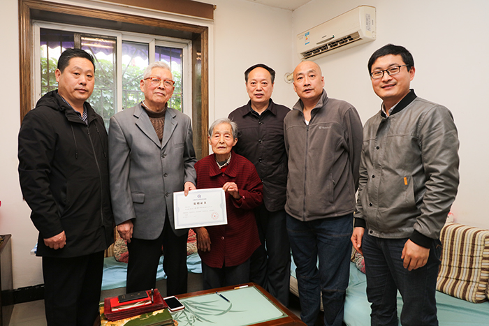 时乾代表学校向两位老同志敬呈了《玩球官方网站_玩球(中国)股份有限公司,校史馆捐赠证书》,祝福两位老同志健康长寿,生活愉快,相约建校70周年校庆。