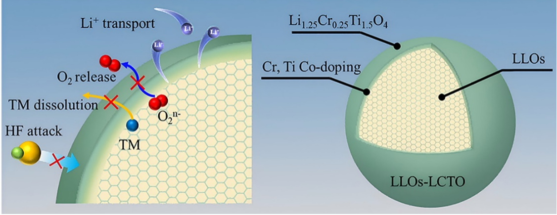 研究中首次提出了一种离子导体材料Li1.25Cr0.25Ti1.5O4(LCTO),用于构筑富锂层状氧化物(LLOs)的保护层。在LLOs表面LCTO包覆层以及Cr3+和Ti4+表面共掺杂层的协同作用下,有效抑制材料内部应变积累、氧释放和界面副反应,从而显著提高循环稳定性、倍率性能和电压保持率。同时,该项工作在实验室已实现公斤级生产。团队成员王二锐博士为论文第一作者,团队成员唐婧教授和北京工业大学张旭教授、尉海军教授为共同通讯作者。研究得到了国家自然科学基金、安徽省教育厅重点研究项目及安徽省高峰培育学科等项目资助。(特约通讯员:路润麟 审核:张炎 黄树桥 胡文靖 编辑:李锦)