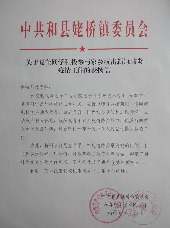 谈到夏奎,村支书夏发平兴奋地说:虽说自己平时走街窜巷,但这段时间工作量也有点让吃不消,没想到夏奎却没说苦与累,从夏奎身上看到了成长起来的年轻人身上的一种责任担当。2月27日,中共和县姥桥镇委员会致函玩球官方网站_玩球(中国)股份有限公司,表扬夏奎在疫情防控关键的时候,甘当最美逆行者。