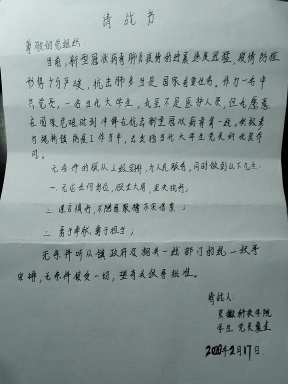 2月17日傍晚,安徽省和县姥桥镇疫情防控人力明显不足,夏奎得知这一情况后,第一时间就向当地党组织递交请战书,请缨参战,村支书夏发平知道夏奎正在积极准备下阶段的考研复试,而疫情防控不是一时之事,怕影响他的复试,于是婉言谢绝了夏奎的请求。夏奎一听急了,找到村支书软磨硬泡,说自己做为一名共产党员,在这个关键时刻理应站出来,怎可能只为考虑自己事而对防控无动于衷,而后又缠着老党员身份的爷爷做村支书的工作,犹豫的村支书终于被夏奎的赤诚之心打动。当晚夏奎与村委班子进一步完善防控措施,修改防控计划直到深夜,次日一早,便开始受领防疫任务。他的工作是到各个村子宣传防疫知识,同时在村子里巡逻,劝导村民不能扎堆聊天,不能不戴口罩出来散步,并张贴宣传标语,进行防赌宣传。
