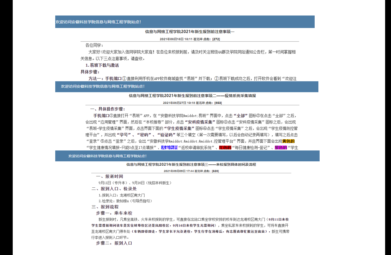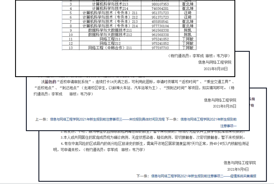 为做好2021级新生教育工作,信息与网络工程学院早谋划、早启动,于8月18日至9月9日,在信息与网络工程学院官网“通知公告”栏,发布新生报到前注意事项三篇。着手开展新生入校前的学生教育管理工作。