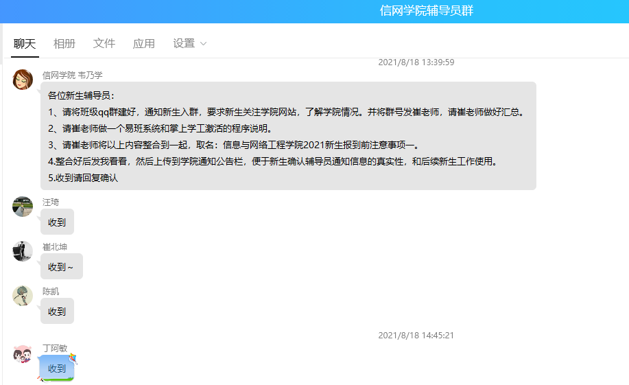 入校爱校教育。8月18日,学院各班级辅导员将建立的班级群通过网络、信息、电话等方式通知到每一位新同学,邀请他们加入到班级群中来。为便于新生确定辅导员信息的真实性,学院将辅导员所建班群的QQ号公布在学院官网,发布“信息与网络工程学院2021年新生报到前注意事项一”,通过这种方式与2021级新同学建立信任的链接。同时,在注意事项中明确了“易班下载与激活”及“学工系统激活”的相关程序和要求,便于新生及时查看和加入。在班级群中,学院要求辅导员引导新同学积极关注学校学院网站,了解相关情况,提前展开大学生活,为后续工作的开展奠定了基础。