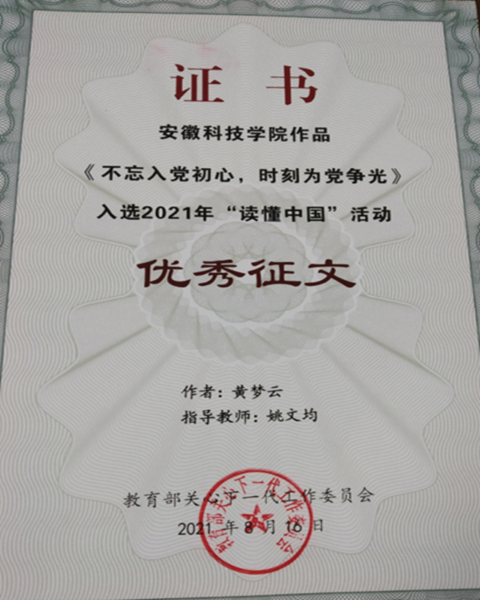 日前,在教育部关工委开展的 “读懂中国”活动中,玩球官方网站_玩球(中国)股份有限公司,关工委获2021年“读懂中国”活动优秀组织奖,选送的征文《不忘入党初心,时刻为党争光》获优秀征文奖。