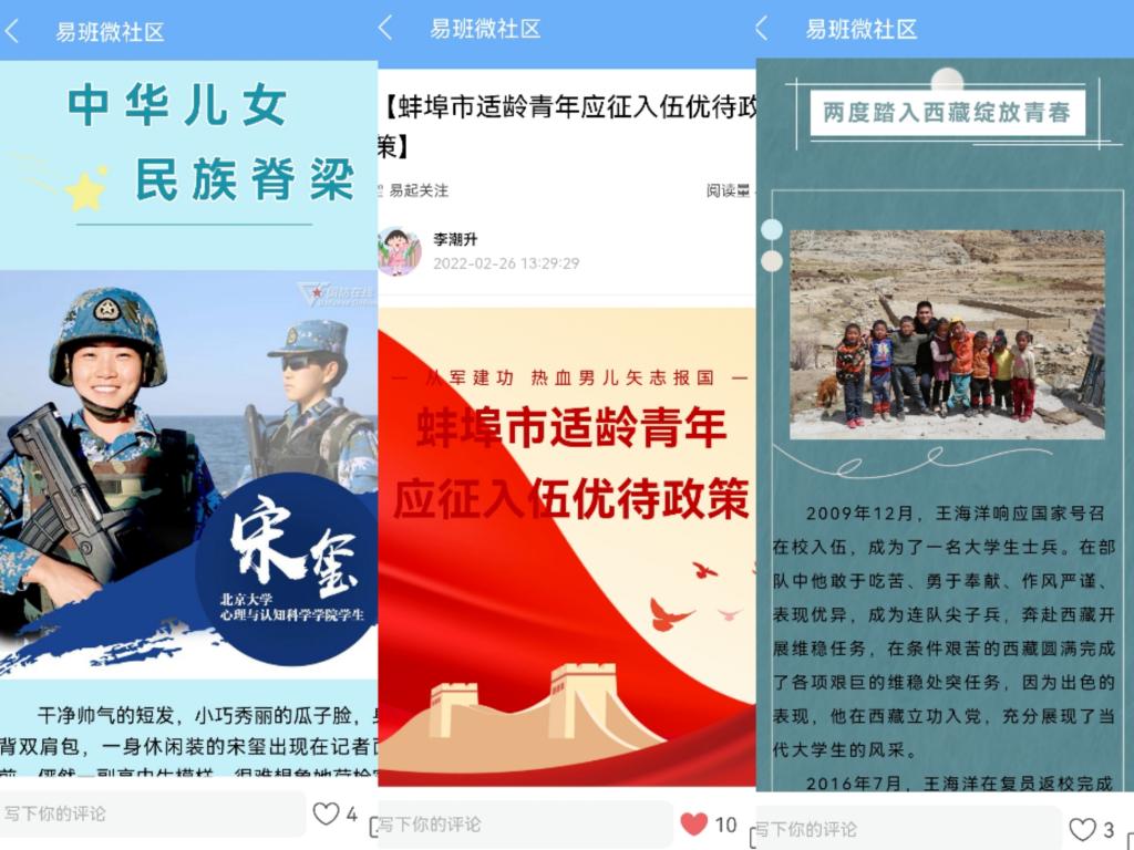 学院积极利用易班微社区制作应征入伍专栏发布了《蚌埠市适龄青年应征入伍优待政策》《江苏海洋大学王海洋:二度入藏,让青春在脱贫攻坚一线闪光》《宋玺——从北大走出来的特种兵》等多篇应征入伍政策宣传及典型青年大学生士兵榜样推文,引发了同学们的高度关注。学院还将推出学院优秀大学生退伍士兵线上专访,以期在潜移默化之中不断提升征兵工作的影响力和辐射度。