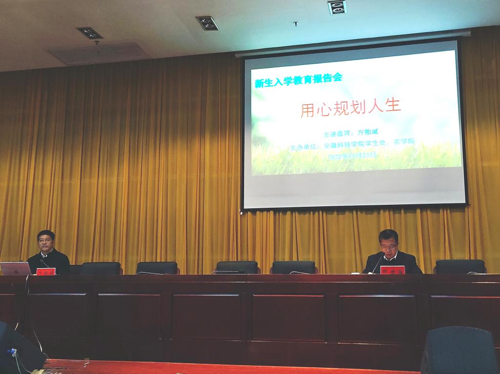为教育引导2022级新生尽快适应大学新生活,明确成长成才新目标,扣好大学“第一粒扣子”,11月23日下午,校学工部(学生处)与农学院在凤阳校区会议中心二楼报告厅联合举办新生入学教育报告会。报告会以“用心规划人生 踏踏实实做人”为题,由高级经济师、安徽省安庆市烟草专卖局党组书记方贻斌应邀担纲主讲。农学院党委书记何世潮主持报告会。