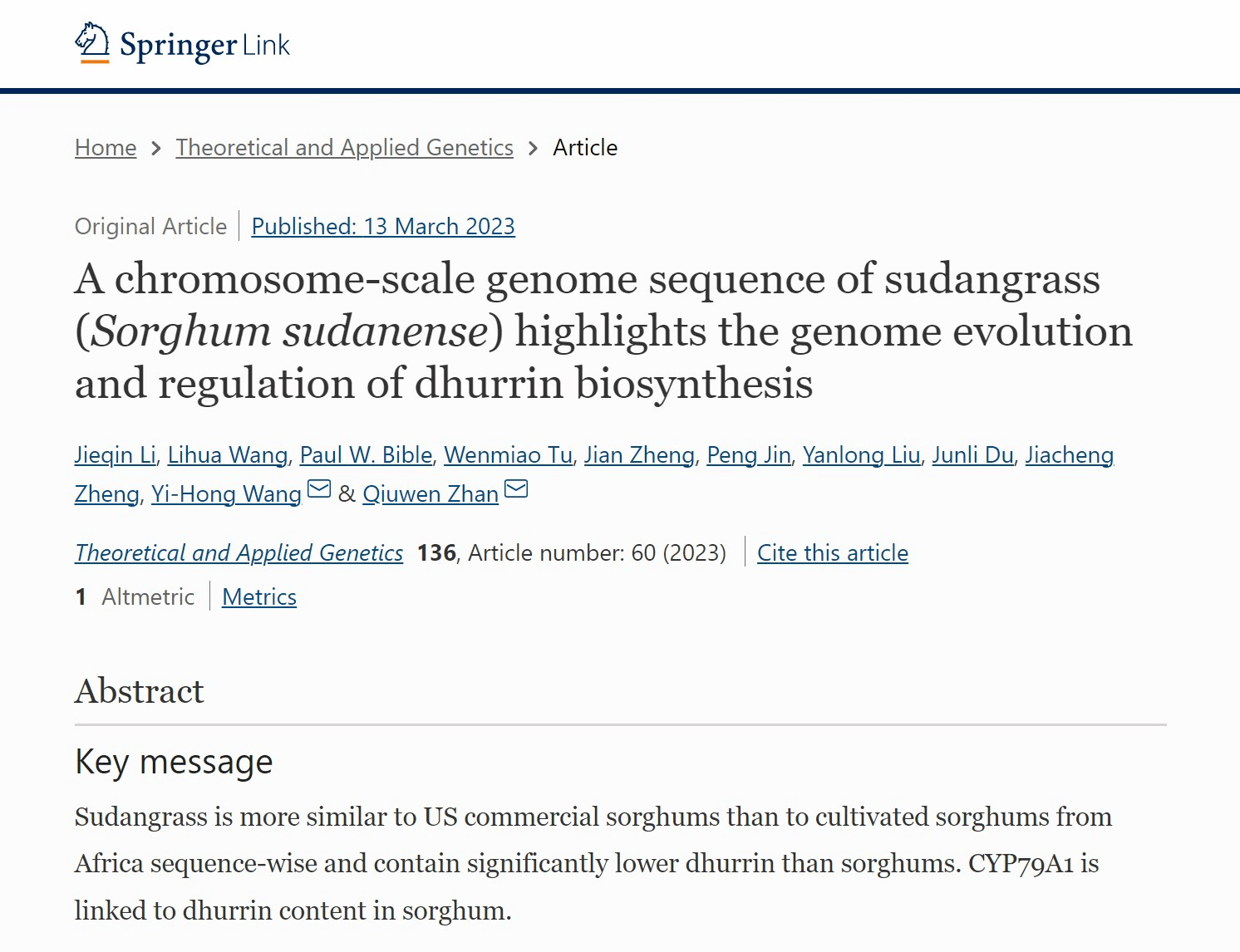 3月13日,由我校李杰勤教授、王丽华老师和美国马里安大学(Marian University)Paul W. Bible教授为共同第一作者,我校詹秋文教授、美国路易斯安那大学拉法叶分校Yi-Hong Wang教授为共同通讯作者的论文“A chromosome‑scale genome sequence of sudangrass (Sorghumsudanense) highlights the genome evolution and regulation of dhurrin biosynthesis”,在国际著名学术期刊《Theoretical and Applied Genetics》(中科院一区)在线发表。该研究在全球首次破译了苏丹草的基因组,对促进苏丹草和饲用高粱及高丹草(高粱-苏丹草杂交种)的品种改良具有重要意义。