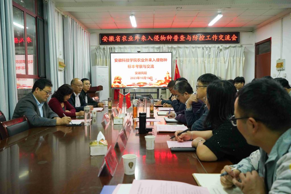 随后省农业外来入侵物种普查与防控工作交流会在农学院会议室召开。会议由何世潮主持,何世潮首先代表学院对各位领导专家赴校考察指导表示热烈欢迎及诚挚感谢,崔广荣和副院长李文阳分别介绍农学院整体情况和植物保护团队建设情况。殷雨虹对我校在省农业外来入侵物种普查与防控工作中所做的工作给予了高度肯定并表示感谢,希望我校在今后的省农业外来入侵物种常规监测及防控工作中继续提供强有力的技术支撑并期待开展更加全面深入地合作。何金铃高度评价了我校在省农业外来入侵物种普查中所做的工作,指出在全省农业外来入侵物种普查数据中,毕亚玲团队数据量丰富、信息记录较为完整、样地调查较规范、植物标本采集与制作优异。