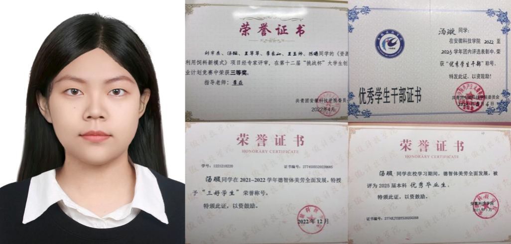 汤璇,2021级动物科学专业本科生,中共预备党员,拟录取至中国农业大学畜牧专业硕士研究生。在校期间曾任班级团支部书记,曾多次获国家级、校级奖学金;荣获校优秀学生干部、优秀共青团员、三好学生、省级优秀毕业生等荣誉。在学科竞赛中,曾获中国国际大学生创新大赛国家级铜奖、第四届全国大学生动物科学专业技能大赛团体和单项二等奖、第九届安徽省“互联网+”大学生创新创业大赛金奖等奖项。