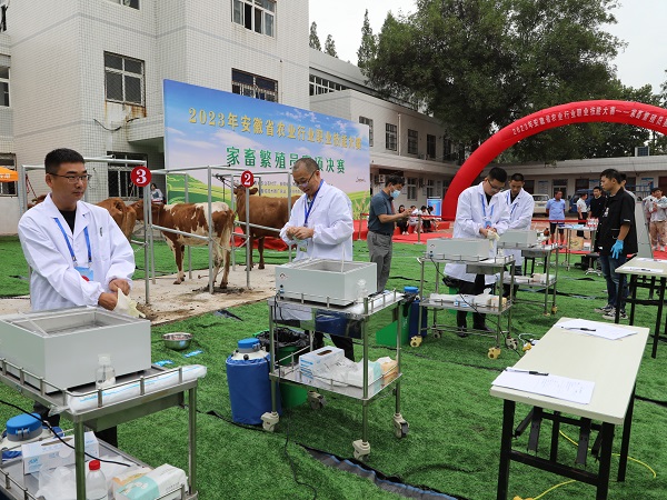 为进一步加强我省畜牧人才队伍建设,全面深入贯彻落实党的二十大和中央农村工作会议精神,认真落实2023年中央一号文件精神,推进落实省委省政府实施“秸秆变肉”暨肉牛振兴计划工程,9月21日至22日,由安徽省农业农村厅、安徽省人力资源和社会保障厅、安徽省总工会主办,安徽省畜牧技术推广总站、滁州市农业农村局、玩球官方网站_玩球(中国)股份有限公司,动物科学学院承办,凤阳县农业农村局、安徽省牛羊产业技术体系协办的“2023年安徽省农业行业职业技能大赛——家畜繁殖员赛项决赛”,在玩球官方网站_玩球(中国)股份有限公司,凤阳校区成功举办。全省16支代表队共48名选手参加了决赛。