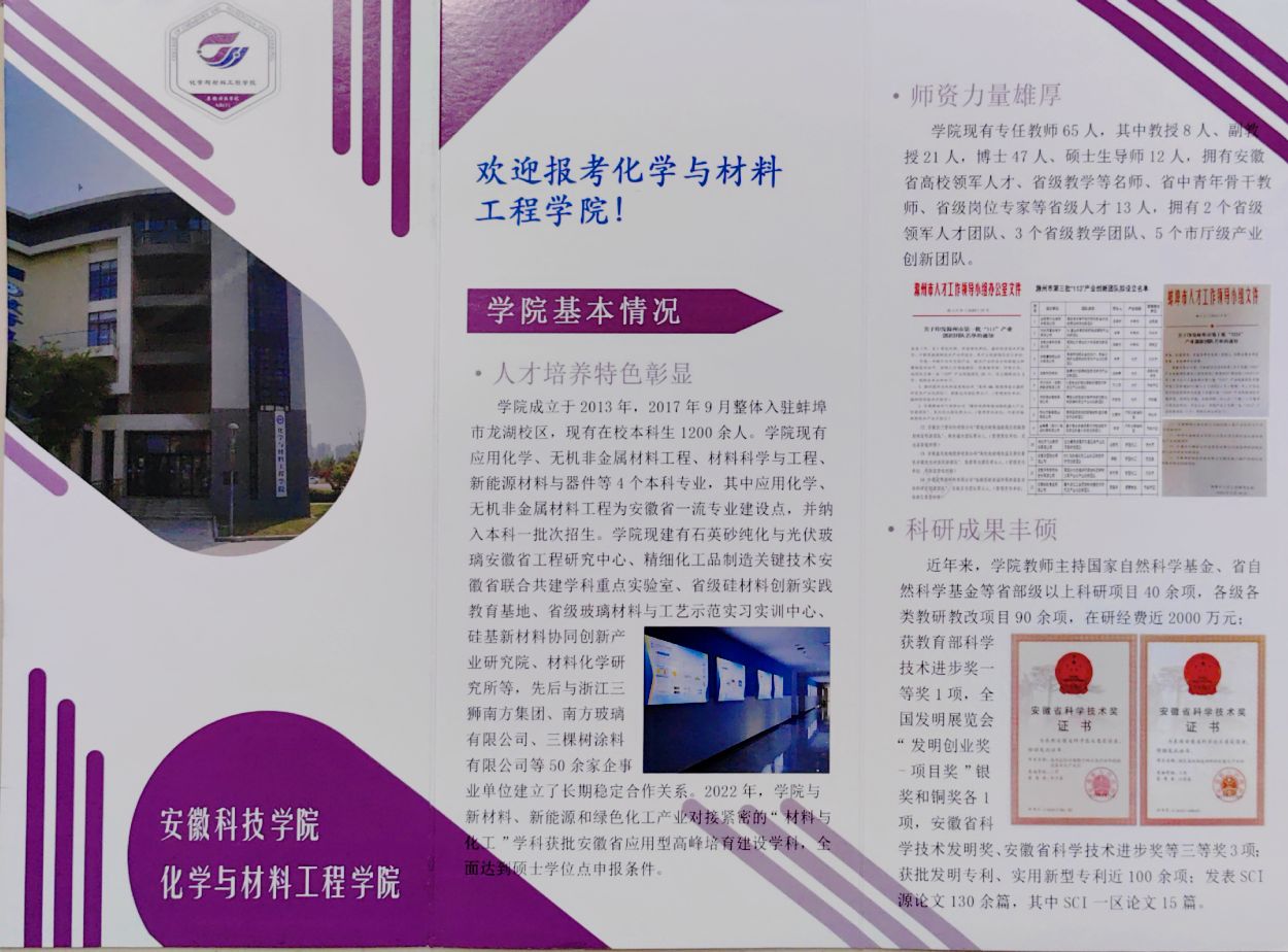 为积极应对新旧高考志愿填报模式转变可能带来的生源质量变化挑战,化学与材料工程学院在高质量完成学校下达的招生宣传任务基础上,学院还制作了“欢迎报考玩球官方网站_玩球(中国)股份有限公司,化学与材料工程学院”H5易企秀,组织师生利用微信群、QQ群宣传;学院印制了“欢迎报考化学与材料工程学院”纸质宣传册子,随同学校的宣传材料一并发放,主动向有化学及材料类报考意愿的考生及家长介绍学院,吸引考生关注学院。