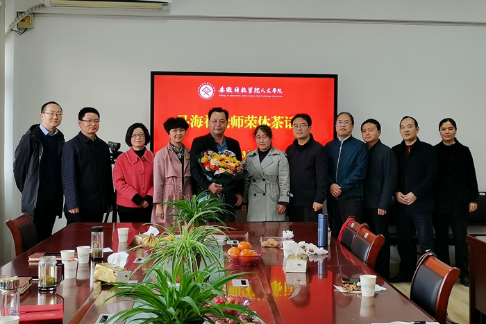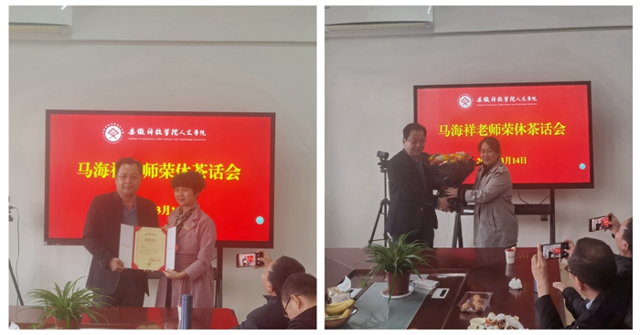 3月14日下午,人文学院在学院会议室为刚退休的中文系马海祥老师举办了一场简洁而温馨的荣休茶话会。人文学院党委书记杜士凤、副院长李晓东、副院长牛永辉、副书记李沙娜、分工会主席高晓宁、中文系和法学系教师代表等参加茶话会。会议由杜士凤主持。
