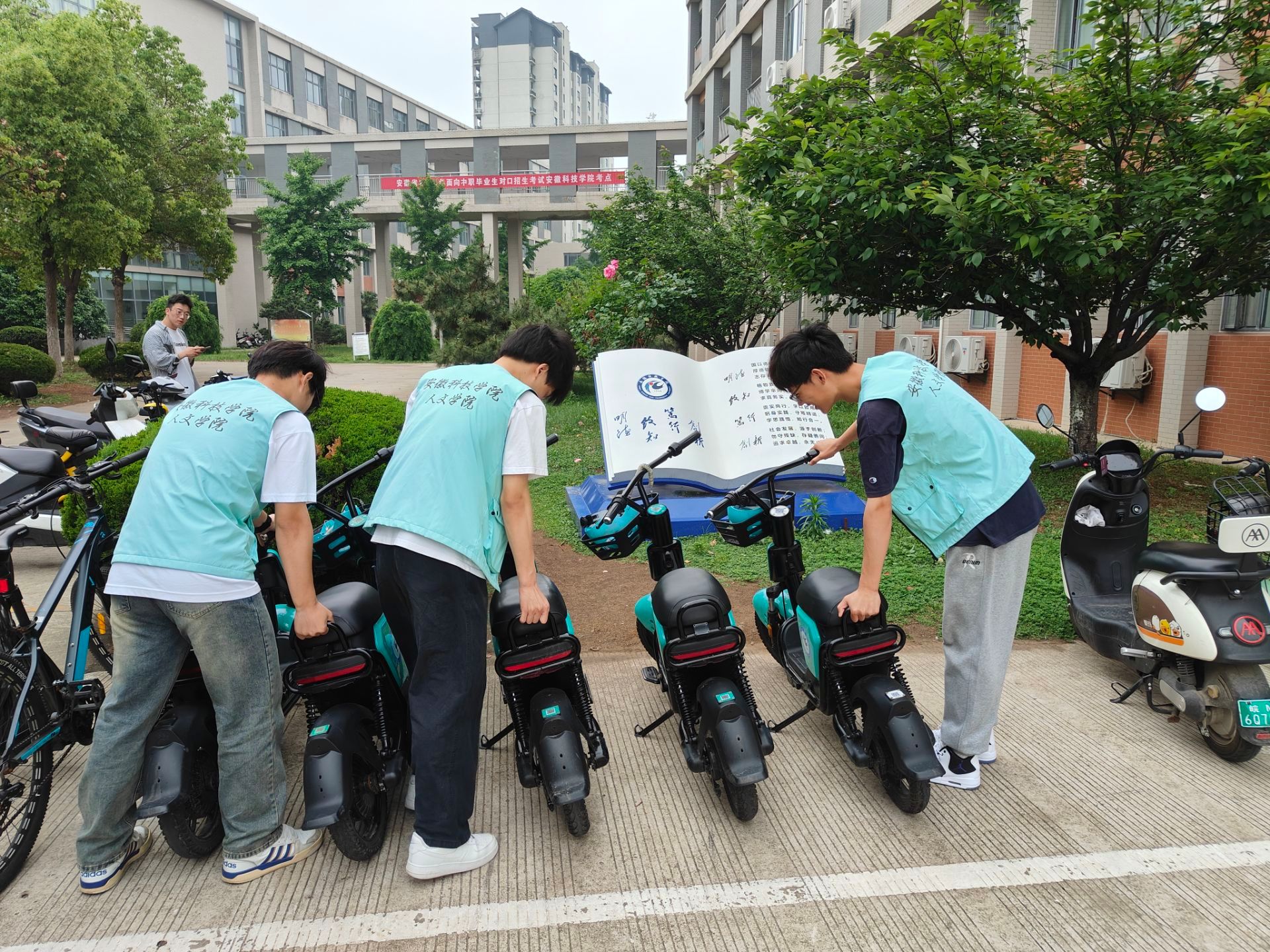在校内外秩序维护和共享单车摆放整理活动中,法学234班的同学们顶着炎炎夏日,在校东西区门口协助保安引导大家走天桥,防止课间堵塞马路而造成交通安全隐患,得到了来往师生的一致好评;随后,同学们又将校内外的电动车、自行车摆放整齐,并简单擦拭。在同学们的努力下,共享车辆更加整齐洁净,校园交通也更加安全有序。