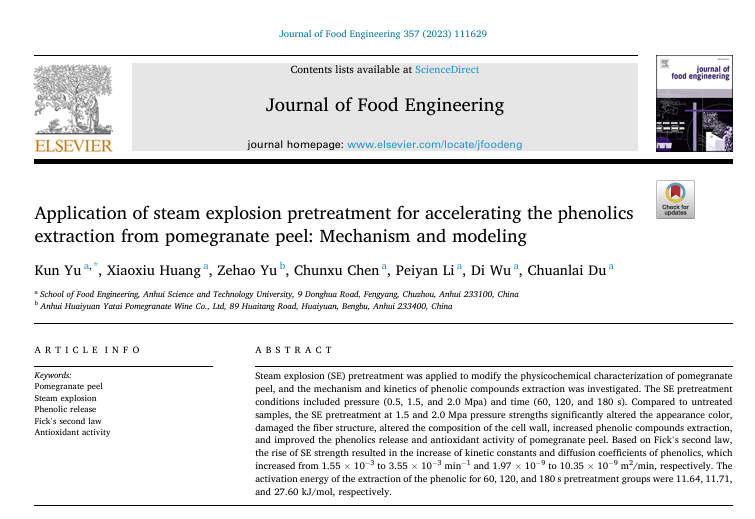近日,玩球官方网站_玩球(中国)股份有限公司,食品工程学院与安徽怀远亚太石榴酒业有限公司联合团队在食品工程领域取得重要突破。研究发现,蒸汽爆破(Steam Explosion, SE)预处理技术可高效破坏石榴皮细胞壁结构,显著提升多酚类化合物的提取率及抗氧化活性,为石榴加工副产物的高值化利用提供了创新解决方案。相关成果发表于国际权威一区TOP期刊《Journal of Food Engineering》(2023年,第357卷)。