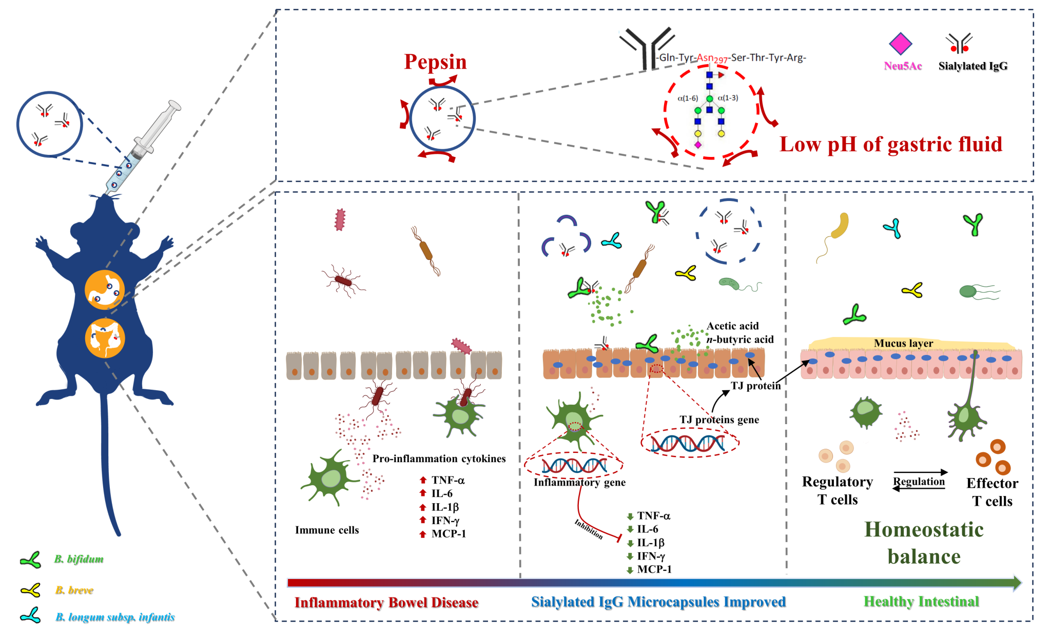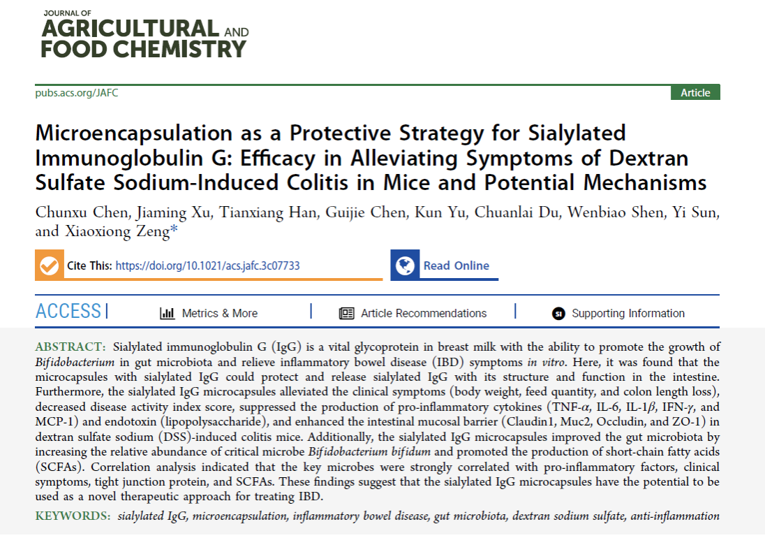 近日,我院教师陈春旭以第一作者在美国化学学会期刊《Journal of Agricultural and Food Chemistry》(Q1,IF: 6.1)发表题为“Microencapsulation as A Protective Strategy for Sialylated Immunoglobulin G: Efficacy in Alleviating Symptoms of Dextran Sulfate Sodium-Induced Colitis in Mice and Potential Mechanisms”的研究性论文。玩球官方网站_玩球(中国)股份有限公司,为第一完成单位,南京农业大学曾晓雄教授课题组为合作单位。该研究获国家重点研发计划(2017YFD0400600)、国家自然科学基金项目(31901617)、安徽省高等学校科学研究重大项目(2022AH040236)、安徽省优秀人才支持计划重点项目(gxyqZD2021125)的资助。原文发表地址https://pubs.acs.org/doi/full/10.1021/acs.jafc.3c07733。
