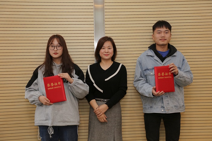 颁奖仪式上,祝萍、刘向青、王力分别为建筑学院费艺青同学、信息与网络工程学院徐璐瑶同学,食品工程学院崔帅同学、农学院王菲菲同学,管理学院高敏同学等获奖代表颁奖,并热情与获奖代表合影留念,表示祝贺。
